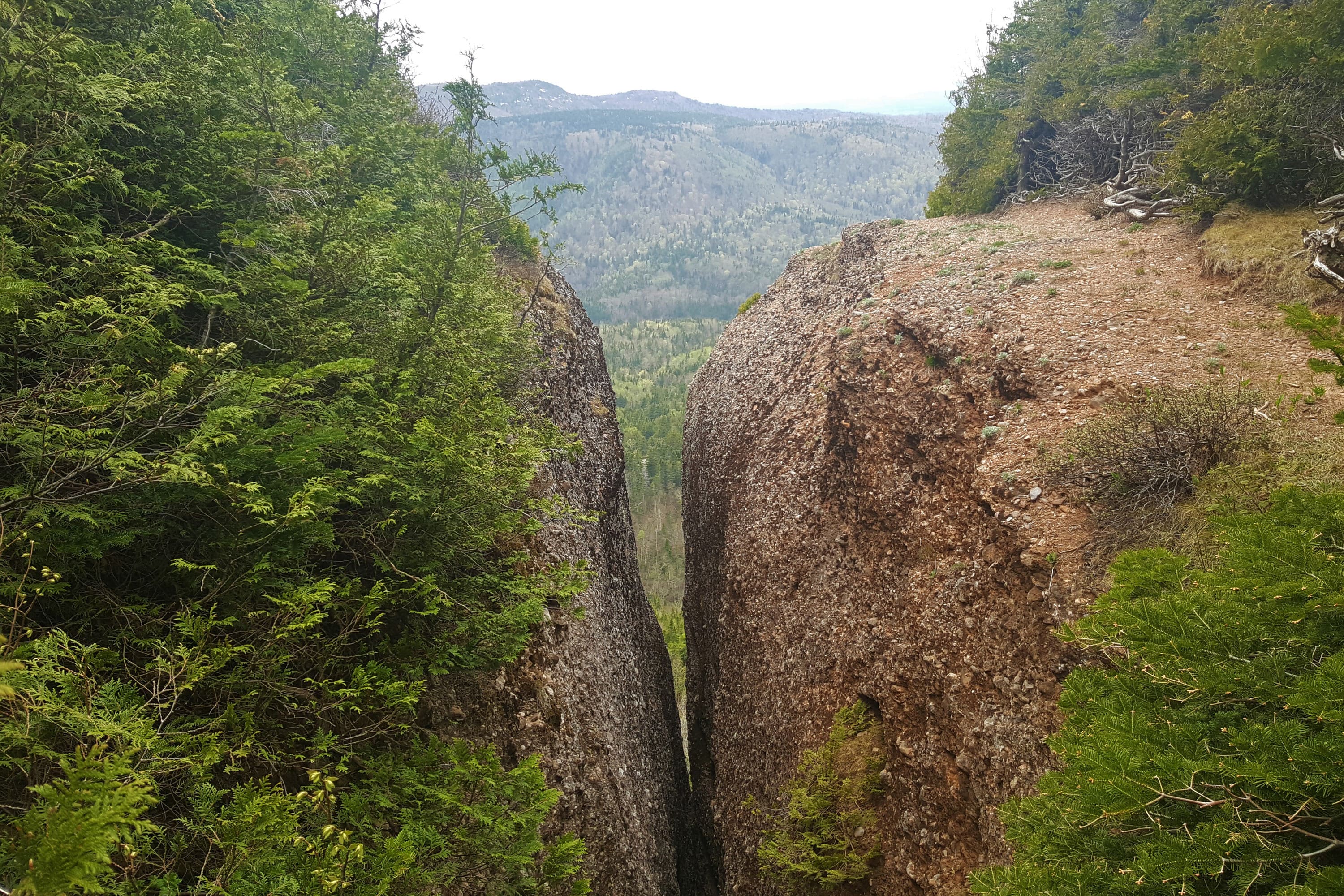Au loin, vous pouvez observer les montagnes ayant été sculptées et adoucies par l’action des glaciers lors de la dernière période glaciaire. La roche présente à la Crevasse appartient à la formation de Bonaventure, comme plusieurs autres de nos géosites en montagne.
