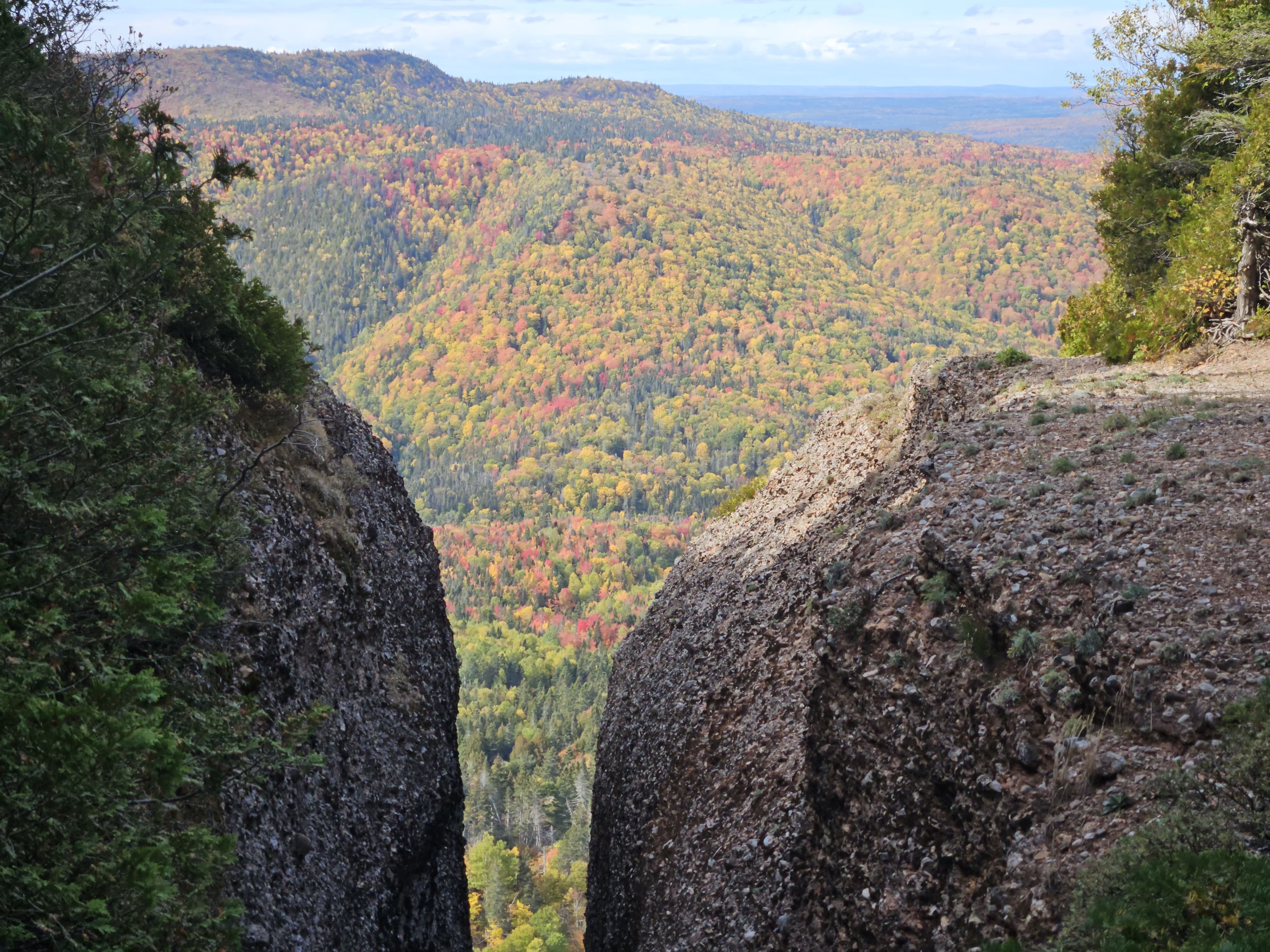 À l’automne vous pouvez observer les arbres colorés de Cannes-de-Roches, la ville située juste au nord de Percé, depuis la Crevasse. Une plante très rare est aussi présente à ce géosite, la vergerette à feuilles divisées (Erigeron Compositus), découverte dans les années 1930 à Percé par M. Pierre Dansereau, botaniste et professeur d’écologie à l’UQÀM. Il s’agit d’une plante vivace d’environ 5 à 15 centimètres de hauteur, qui comme d’autres plantes rares retrouvées ici en montagne sont vestiges d’un environnement arctique-alpin postglaciaire. On vous demande donc de rester dans les sentiers pour les protéger et pour votre propre sécurité.