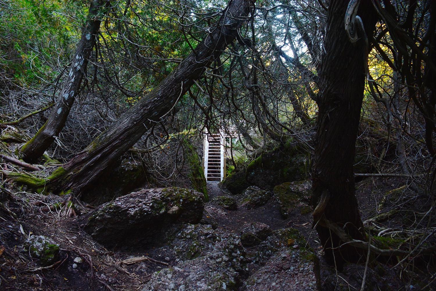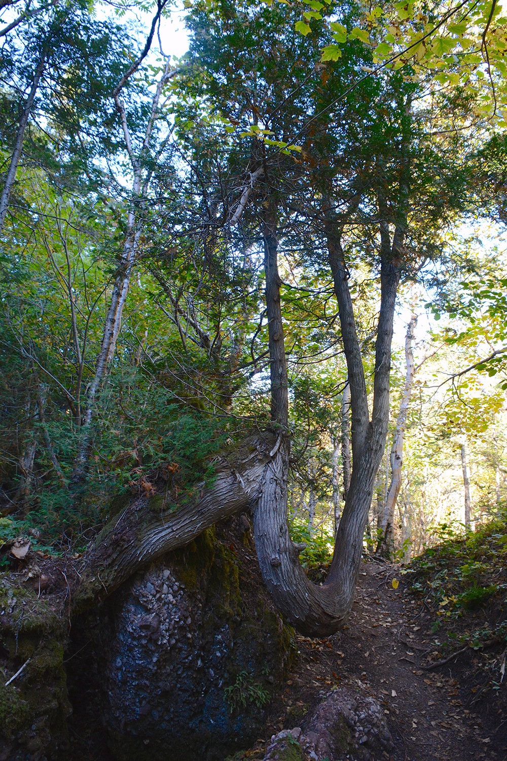 Voici quelques caractéristiques du thuya occidental : ses feuilles sont en formes d’écailles, porteuses de glandes résinifères d’une longueur de 1 à 2 mm. La couleur est souvent d’un vert jaunâtre d’un éclat mat. Sa couleur peut changer en hiver vers une teinte qui tend vers le bronze. Ses groupes de ramules s’étalent en éventail rigide qui se forment de façon générale en un plan horizontal. Ses cônes maturent à la fin de l’été et leur chute se fait graduellement sur plusieurs mois. Son bois est très léger et tendre, vous reconnaîtrez son odeur caractéristique dès votre arrivée. Ces arbres peuvent vivre sur plusieurs centaines d’années et leur diamètre peut même atteindre 90 cm, bien que 30 cm soit plus commun. La hauteur typique du thuya occidental est de 15m, mais peut atteindre 25m. Leur tronc sont souvent penchés à la base et se redressent par la suite sur leur longueur. Leurs racines sont superficielles et s’étalent latéralement, vous en verrez plusieurs sur les blocs de conglomérats de la Forêt magique. Ces arbres aiment la roche calcaire présente dans nos conglomérats.